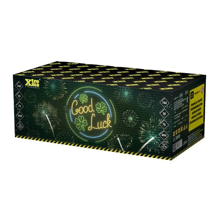 Szerezd be a Good Luck tűzijátékot, amely egy 160 lövéses 14 mm, 16 mm és 19 mm kaliberű csövekből álló, vegyes show box telep.