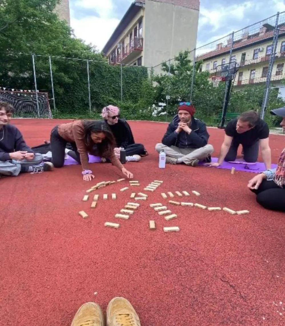 Az udvarban egy rövid interaktív fenntarthatósági workshopon is részt vehettünk, ahol újragondolt Jenga- és Dixit-játékokon keresztül tanulhattunk Matétól. Megtudtuk azt is, hogy az udvarnak saját közösségi kertje van, amely a helyiek által választott részvételi költségvetésből valósult meg.